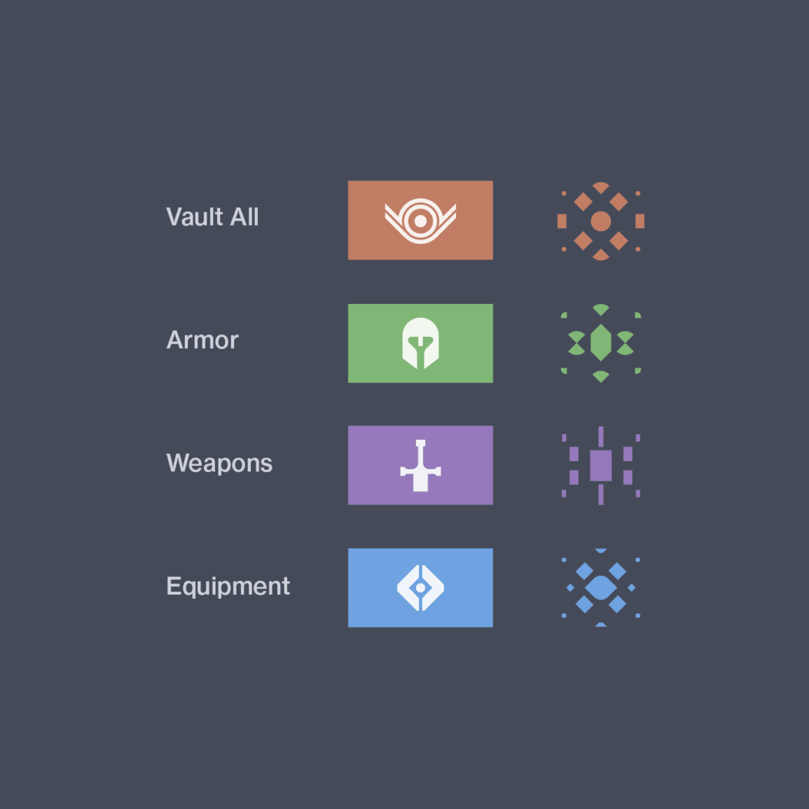 Likewise, the background graphics for category buttons were based on their corresponding icons. The Weapon graphic is rectangular, Armor round and sharp, and the equipment pattern is comprised of diamonds. Because the Vault houses all of these, the first Vault pattern is a combination of these three shapes.